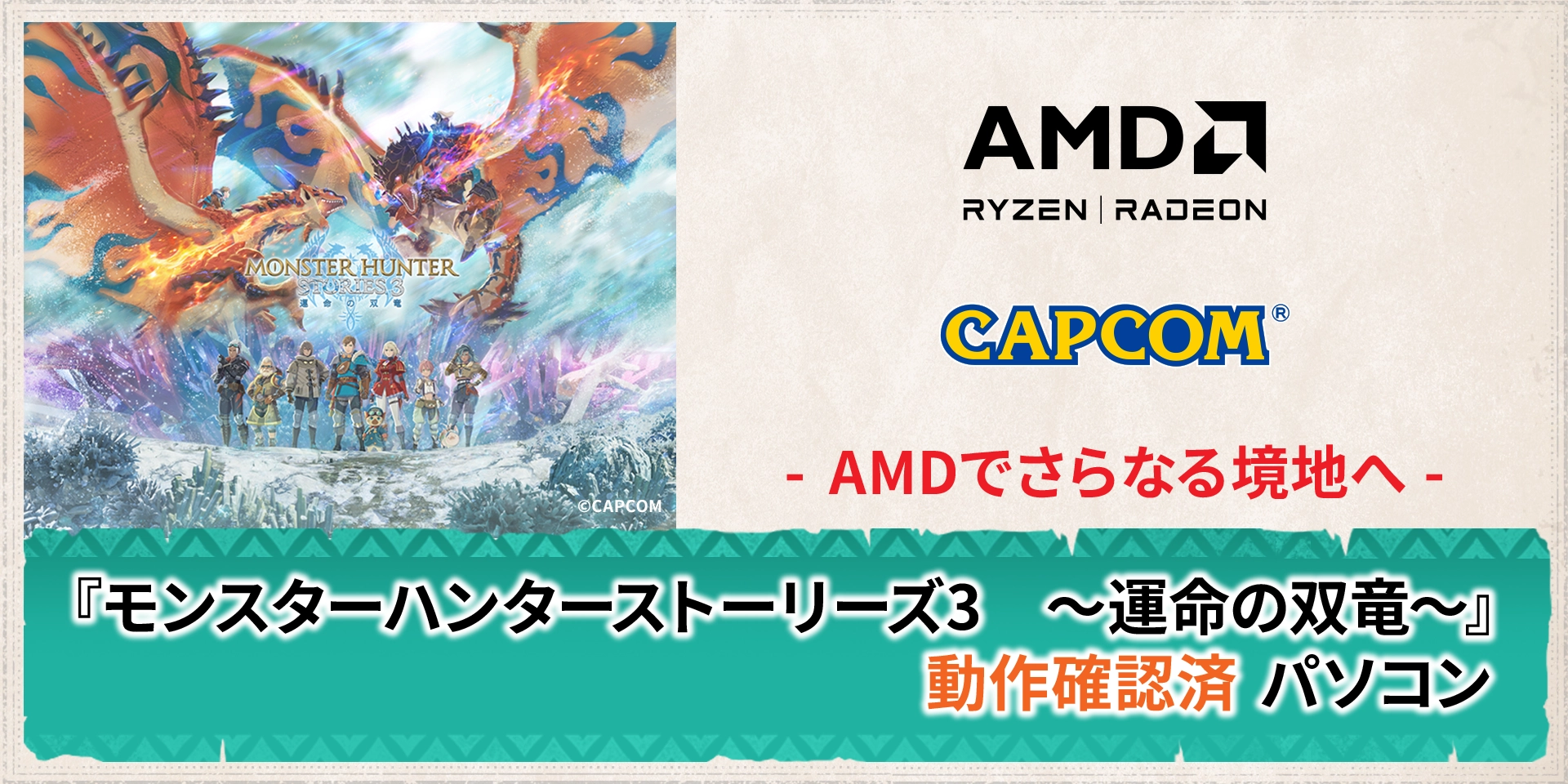 『モンスターハンターストーリーズ3』の動作推奨スペックを満たし、各BTO PCメーカーにて動作検証を行った、安心・快適にプレイを楽しむことができるパソコンです。AMD Ryzen™ プロセッサと AMD Radeon™ グラフィックス カードによる圧倒的なゲーミング・パフォーマンスで『モンスターハンターストーリーズ3 』の世界をお楽しみいただける、 各BTO PCメーカーから発売の『モンスターハンターストーリーズ3 』動作確認済パソコンをお選びください。