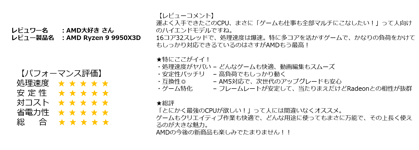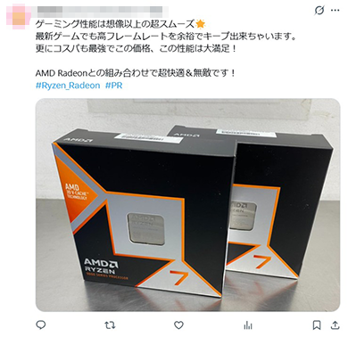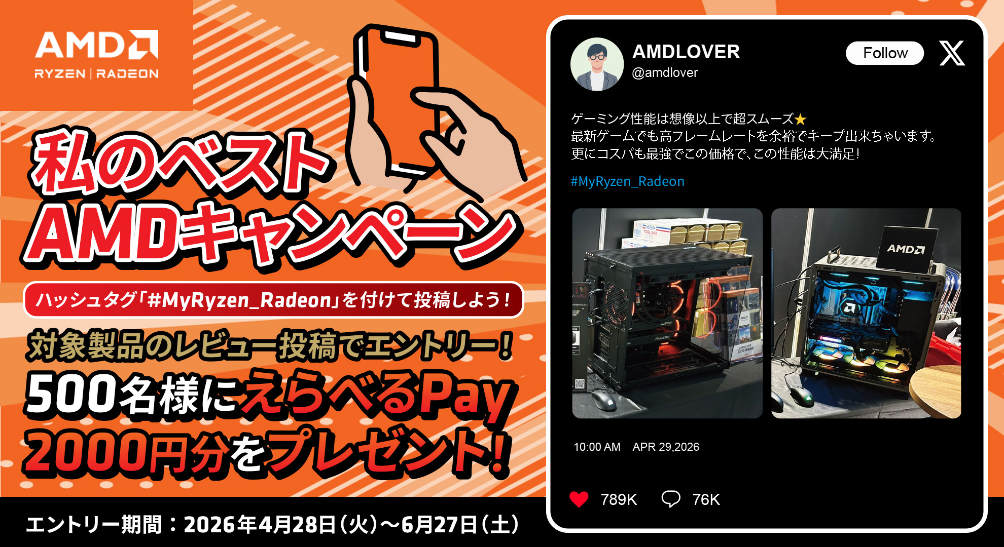 - X (旧Twitter)でのレビューの場合は『#MyRyzen_Radeon』『#PR』の記載および製品画像が必要となります。また、#MyRyzen_Radeonおよび#PRを含む 110文字以上 のレビュー投稿が必須条件です。