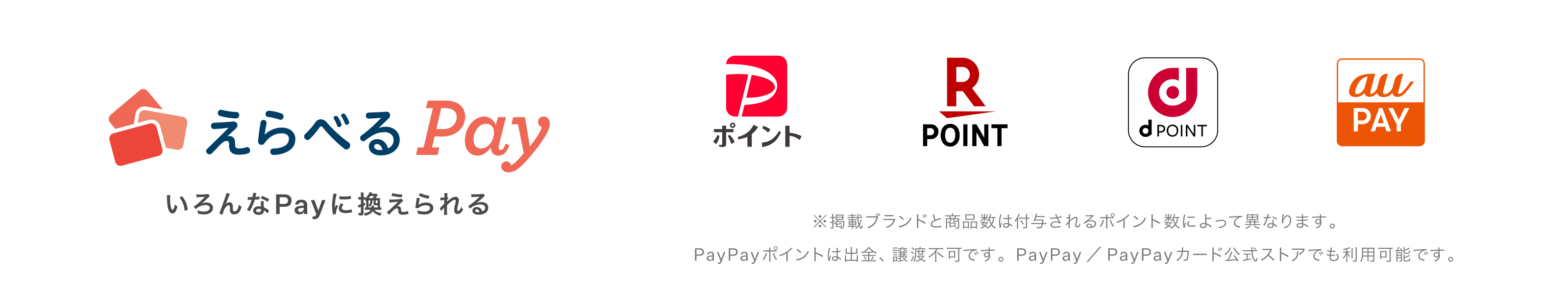 - ラインナップおよび交換に必要なポイントは付与されたえらべるPayにより異なり、変更になる場合がございます。またえらべるPay内のポイント交換レートは商品により異なります。記載された必要ポイント数をよくご確認の上、商品と交換ください。